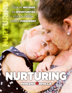 Remember, nurturing means changing the behavior, not the child. No child is born with a proper sense of good behavior. Just like adults, they make mistakes and that is how they learn. Make sure to look at their mistakes as opportunities for education versus punishment.